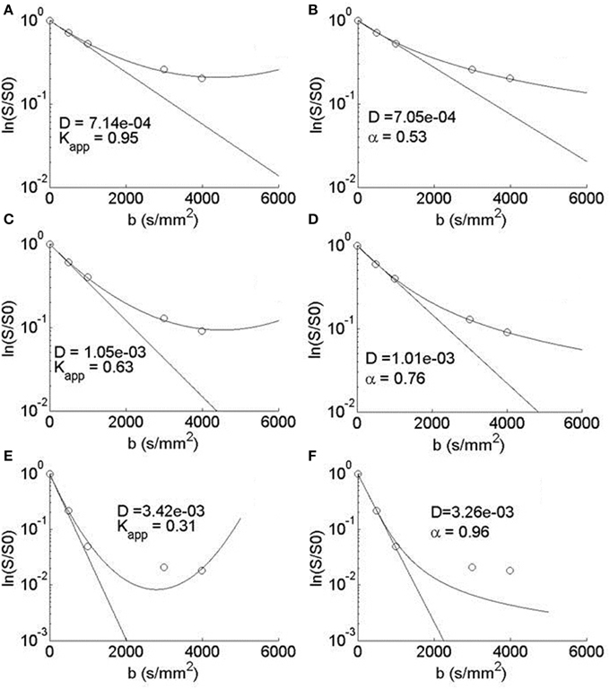 Figure 7. Semilog plots of typical voxel fits to Equation (24) in the (A) WM, (C) GM, and (E) CSF ROIs and Equation (22) in the (B) WM, (D) GM, and (F) CSF ROIs. Each equation's estimation of D (mm2/s) is shown to visualize a monoexponential fit and therefore the deviation from Gaussian diffusion.
