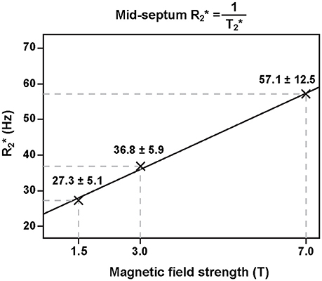 Figure 2. Relation of ventricular septal and static magnetic field strength. Myocardial increases linearly with magnetic field strength (adapted from Meloni et al. [36] with permission from John Wiley and Sons).