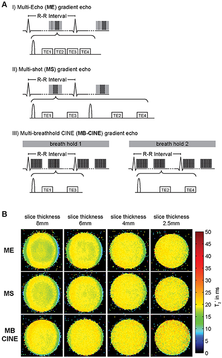 Figure 5. Acquisition schemes used for T2* weighted imaging/mapping and corresponding T2* maps. (A) (I) multi echo gradient echo (MEGRE) acquisition, (II) multi shot (MS) interleaved multi gradient echo acquisition, (III) multi breath hold CINE (MB-CINE) interleaved multi gradient echo acquisition. (B) Comparison of T2* maps derived from a homogenous phantom resembling myocardial tissue acquired using the three different approaches and slice thicknesses from 8 to 2.5 mm. All acquisition strategies provide similar T2* maps. Through plane dephasing is reduced for lower slice thickness (adapted from Hezel et al. [39].)
