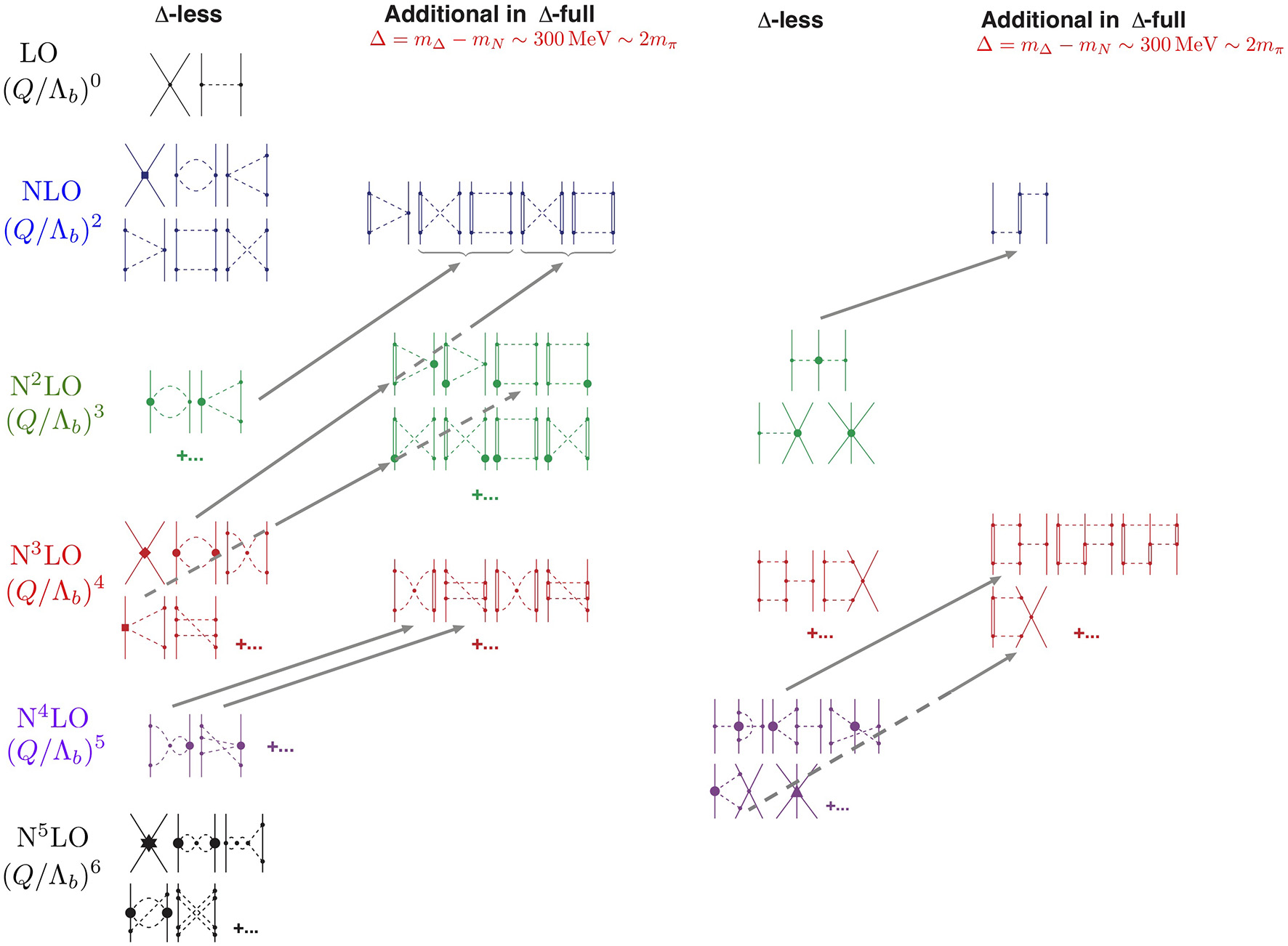 At next order, N2LO, the sub-leading NN TPE diagrams contain vertices (large solid dots) proportional to the so-called ci coefficients. The values of these parameters can be obtained by pion-nucleon (πN) [6067] or NN scattering data [41]. In the delta-less chiral EFT, these coefficients mimic the effect of the Δ-isobar (or some other meson resonances) through a mechanism known as resonance saturation. Hence, they are enhanced in magnitude and found to be “unnaturally” large. The explicit inclusion of the Δ isobar in the delta-full theory reduces the strength of the ci's and promotes the corresponding contributions to a lower order (see gray arrows in Figure 1). As a consequence, the convergence of the expansion in the delta-full theory improves considerably at these orders. In the delta-full approach, additional sub-leading TPE contributions appear that have also been worked out at this order [60].