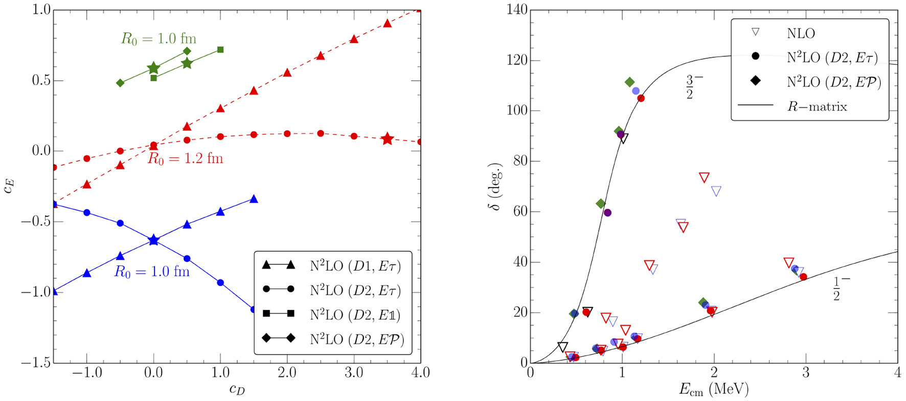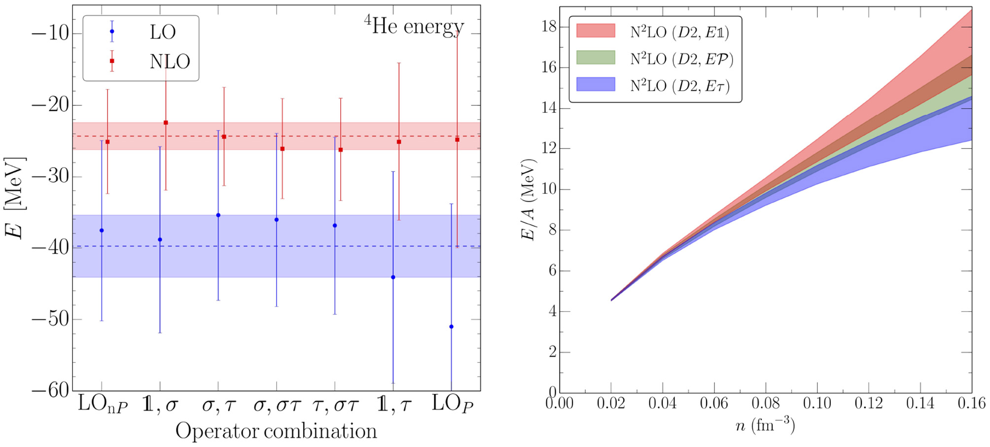 QMC methods, for example variational (VMC) and Green's Function Monte Carlo (GFMC) [10, 98] techniques, provide reliable solutions of the many-body Schrödinger equation—presently for up to A = 12 nucleons—with full account of the complexity of the many-body, spin- and isospin-dependent correlations induced by nuclear interactions. The sampling of configuration space in VMC and GFMC simulations gives access to many important properties of light nuclei, such as spectra, form factors, transitions, low-energy scattering, and response functions. Auxiliary Field Diffusion Monte Carlo (AFDMC) [10, 98] uses Monte Carlo techniques to additionally sample the spin-isospin degrees of freedom, enabling studies of, for example, nuclei up to A = 16 [99, 100] and neutron matter [90, 91, 101103, Piarulli et al., private communication] that is so critical to determining the structure of neutron stars. QMC simulations have surely proved to be very valuable in attacking many nuclear-structure problems over the last three decades but require local chiral interactions as input. Therefore, there is a need to develop local chiral interactions for the use in QMC methods in order combine these accurate many-body methods with systematic nuclear interactions and to test to what extent the chiral EFT framework impacts our knowledge of few- and many-body systems.