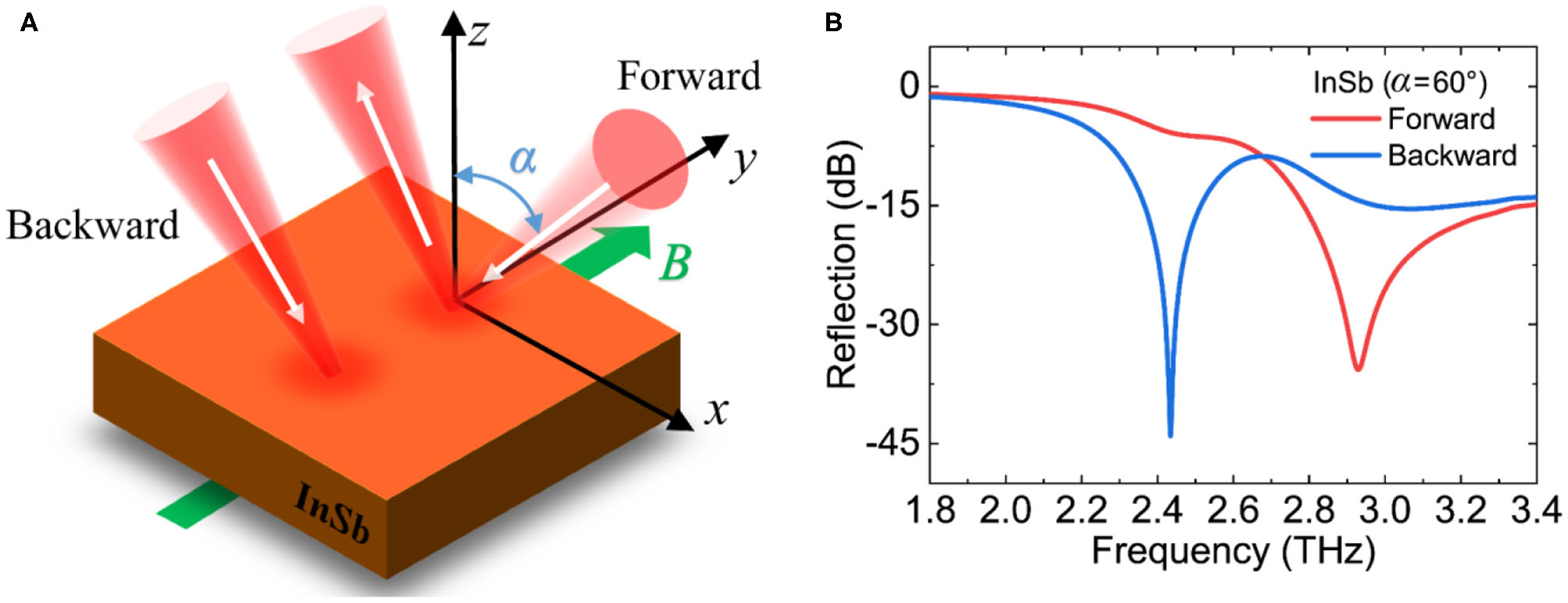 (A) Schematic diagram of the THz optical isolator for the InSb wafer with magnetic field along the y axis. A THz beam is incident in the x–z plane with the incident angle of α and is p-polarized. (B) The reflection spectrum of the forward wave and backward wave when α = 60° and B = 0.2 T.