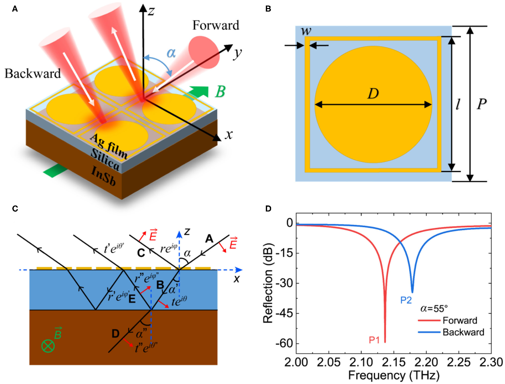 (A) Schematic diagram of the proposed THz optical isolator for the InSb with metasurface. (B) The geometry of the unit cell metasurface, P = 60 μm, l = 57 μm, w = 2 μm and D = 49 μm. (C) Multiple reflections and interference model of the proposed THz optical isolator for the InSb with metasurface. (D) The reflection spectrum of the forward wave and backward wave when α = 55° and B = 0.2 T.