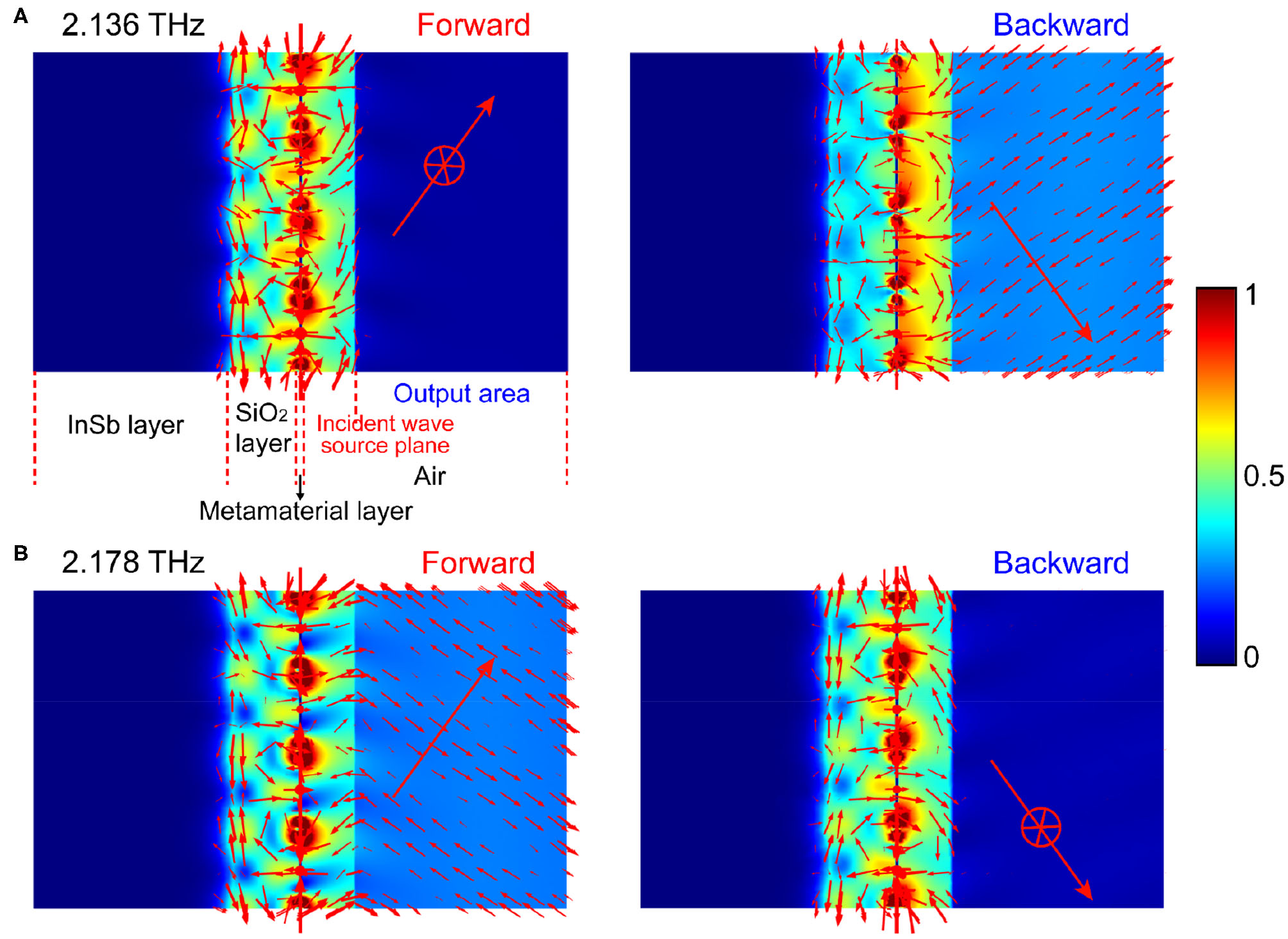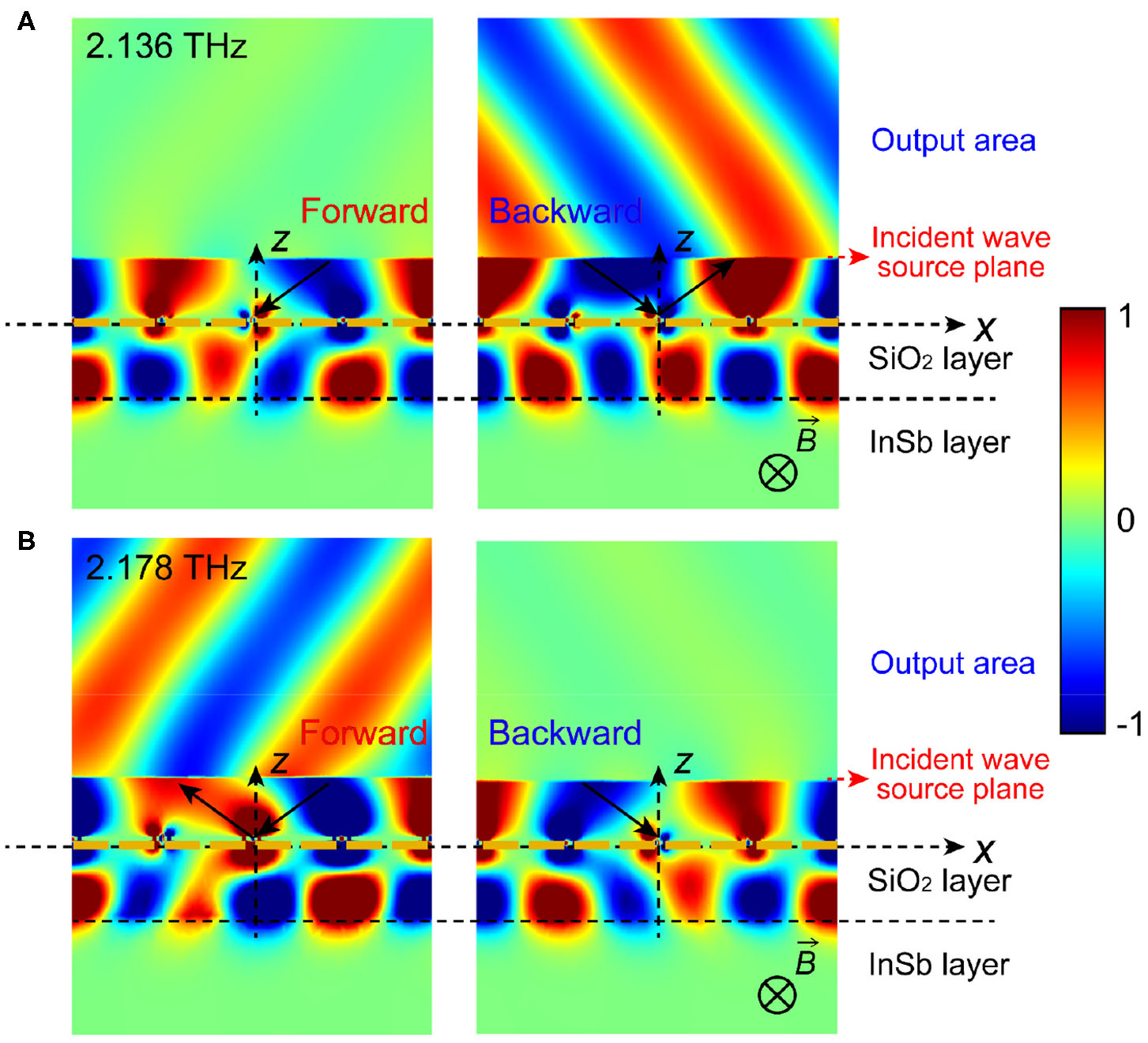 The electric field (color) and the magnetic field (arrows) distributions of the proposed THz optical isolator when α = 55° and B = 0.2 T at different frequencies: f = 2.136 THz (A) and f = 2.178 THz (B). THz waves are incident from the source plane to the MO microstructure (i.e., to the left), and then reflected by the MO microstructure. The reflected wave finally enters the air on the right side. The left side of the source plane is the total field distribution, including the incident field and the reflected field. The right side of the source plane is the pure reflected field distribution.