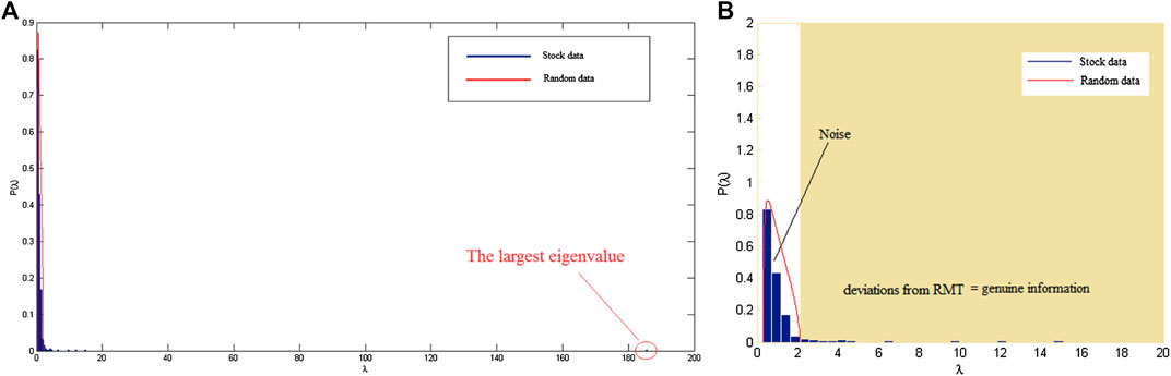 FIGURE 4. The distribution of eigenvalues from the C matrix and the R matrix. The blue color represents the distribution of the eigenvalues of the matrix C, and the red one shows the distribution of the eigenvalues of the matrix R on the S&P 500 daily stock price data for the period of January 1, 2007 until October 28, 2016. (A) eigenvalue in the scale for λ of 1‒200 and (B) The eigenvalue in the zoomed scale for λ of 1-20.