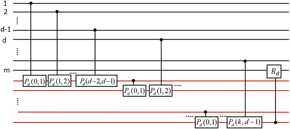 The second step is decomposing and . In other words, and need to be decomposed in terms of multi-qudit-controlled gates. For convenience denote aswhich acts on the -dimensional computational basis of m-qudit space. It is proved in the appendix of Ref. 108 that each can be decomposed into some combinations of and where is the permutation of and state. The third step is using the two-qudit gates and to complete the decomposition of . Figure 1 shows a possible decomposition for . There are auxiliary qudits in the circuits ( denotes the smallest integer greater than x). The last box contains or . is implemented with these gates combined. All of the three steps together prove that the qudit gates setis universal for the quantum computation using qudit systems.