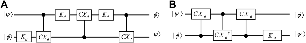 (A) is the qudit SWAP circuit using and gates [58, 131]. (B) is the qudit SWAP circuits with the , the and the gates.