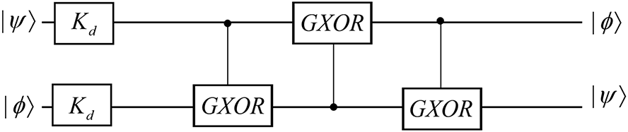 is generated with three steps: a qudit generalization of the gate as sandwiched by two quantum Fourier transform operations (QFT). The circuit illustration for the sequence of theses gate is shown in Figure 4B. The QFT transforms the into a uniform superpositionThe gate adds a phase to the target qudit depending on the state of the control qudit. Its effect on the input qudits isThe inverse QFT undoes the Fourier transform process and the inverse of isThe full evolution of the isIt is easy to show that is its own inverse and then . For the proposed SWAP gate, both the QFT and operations are realizable on a multilevel quantum systems. For example, there are implementations of them for multilevel atoms [118, 145]. The resulting SWAP gate provides a way to connect systems limited to the nearest-neighbour interactions. This gate provides a useful tool in the design and analysis of complex qudit circuits.