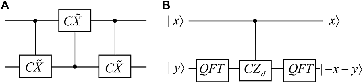 In the rest of this section, we present a Hermitian generalization of the qudit CNOT gate with a symmetry configuration and a qudit SWAP circuit with a single type of qudit gate as shown in Figure 4A [61]. Compared with all the previously proposed SWAP gate for qudit, this method is easier to implement since there is only one type of gate needed. To begin with, we define a gate acting on d-level qudits and such thatwhere represents a state in the range mod d. Notice that, for , the gate is equivalent to the CNOT gate. The SWAP gate for qudit can be built using three gates.