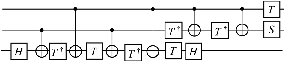 Decomposing qubit Toffoli gate with the universal qubit gates. H is the Hadamard gate, T is the gate and S is the phase gate.