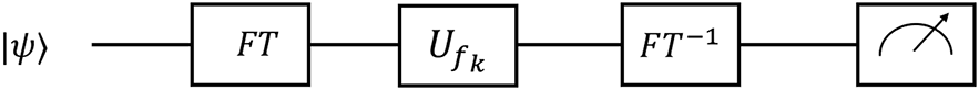 Schematic view of the quantum circuit for the parity determining algorithm. is the Fourier transform and is the gate that does one of the two permutations and the last box represents the measurement.