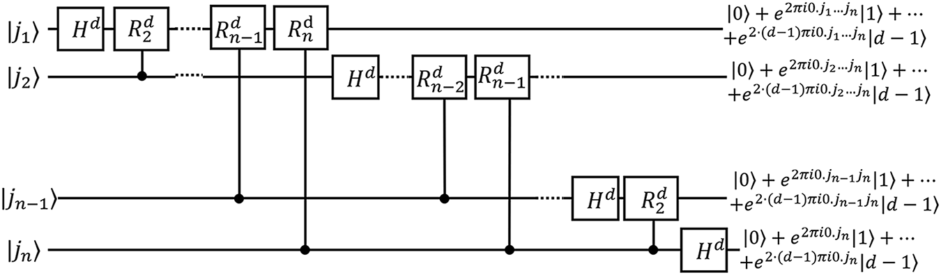 The quantum Fourier transform algorithm (QFT) is realizable on a qubit system [125]. QFT, as the heart of many quantum algorithms, can also be performed in a qudit system [145, 165]. In an N-dimensional system represented with n d-dimensional qudits, the QFT, , where , transforms the computational basisinto a new basis set [26]For convenience, we write an integer j in a base-d form. If thenand, if , thenThe QFT acting on a state can be derived and rewritten in a product form asThis process can be realized with the quantum circuit shown in Figure 10, and the fully expanded expression of the product form is shown on the right side of the figure. The generalized Hadamard gate in the figure is defined as which effects the transformThe matrix representation of isIn the circuit the gate is a phase gate that has the expressionThe black dots in the circuit are multi-value-controlled gates that apply to the target qudit j times for a control qudit in state . In order to complete the Fourier transform and ensure the correct sequence of , a series of SWAP gates are applied at the end, which are not explicitly drawn in Figure 10.