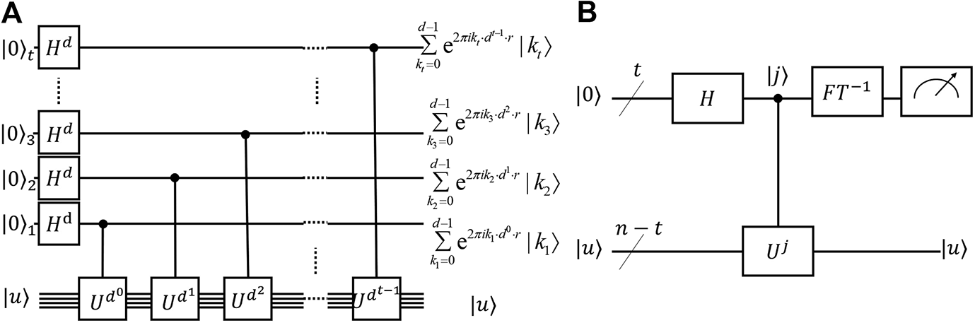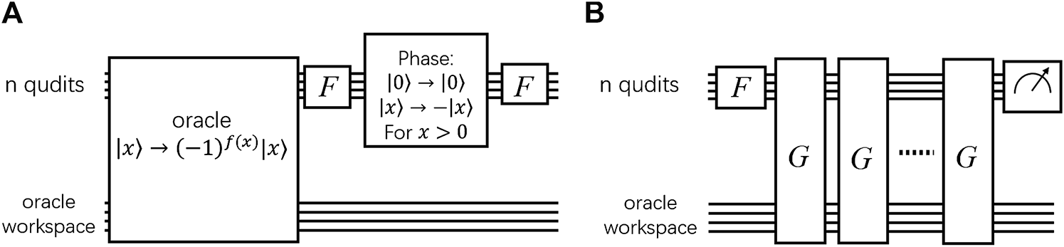 (A) is the qudit SWAP gate with the gate. (B) is the decomposing gate. The represents the quantum Fourier transform while is the selective phase shift gate.