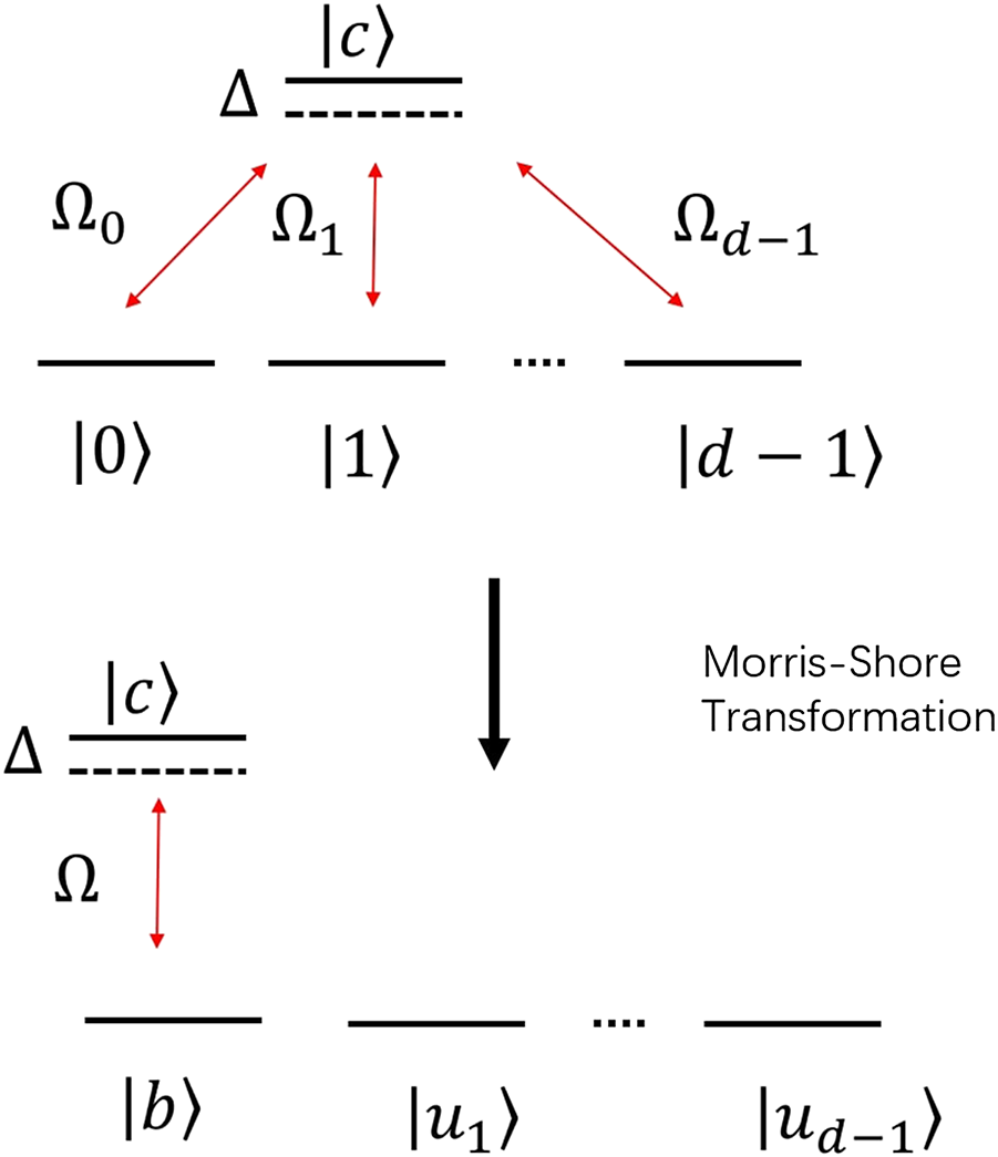 A qudit is a quantum version of d-ary digits whose state can be described by a vector in the d dimensional Hilbert space [23]. The space is spanned by a set of orthonormal basis vectors . The state of a qudit has the general formwhere . Qudit can replace qubit as the basic computational element for quantum algorithms. The state of a qudit is transformed by qudit gates.