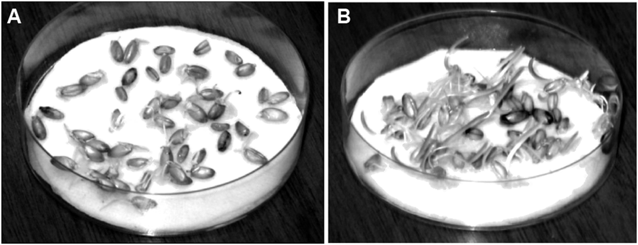 Seeds of spring spelled grade “Gremme” were germinated in a Petri dish on a soaked paper filter. A solution of 2 × 10–5 M KH2PO4 was used for paper towel soaking as the control condition. The Plasmolite stimulating solution was used in the experimental condition. Before carrying out the soaking, the Plasmolite solution was diluted with distilled water in a ratio of 1–500 to achieve a KH2PO4 concentration of 2 × 10–5 M.