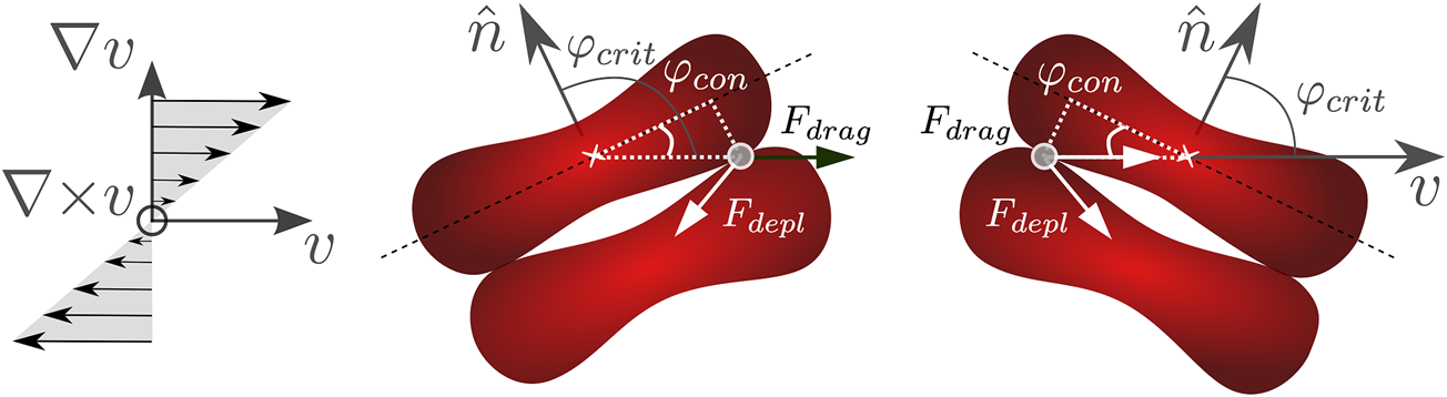 We now focus on the moment when the doublet resides with the orientation such that it can be separated, i.e., φ < |φcrit|. Out of equilibrium, when subjected to shear flow, the RBCs are separated by a stokes drag force, which can only occur when the doublet is oriented such that there is a gradient in the velocity between the two cells. Thus, the RBC experiences the relative drag force of the surrounding fluid, as illustrated in Figure 1: