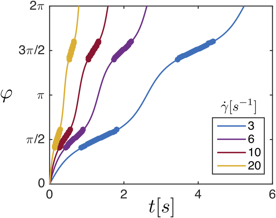FIGURE 2. The angle φ that the normal of the doublet makes with the velocity direction over t for a single doublet at different shear rates. The filled circles represent the range of the angle, φcrit, when the tumbling aggregates are in the orientation such that they can be broken-up.