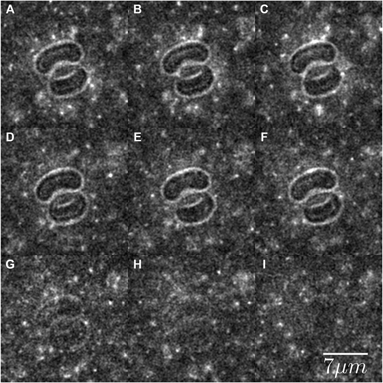 At physiological pH, fd is highly negatively charged and therefore it is expected that it will not have any specific attractive interaction with the red blood cells. To establish that indeed fd does not interact with the red blood cells in a non-trivial manner, we observed the mixture of RBCs and fluorescently labeled fd to qualitatively access any interaction. Figure 3 presents images of red blood cells dispersed in mixtures of fluorescently labeled and non-labeled fd. Initially, both the LED and the halogen lamp were switched on, see Figure 3A–F, to visualize the RBCs and fd. Then the intensity of the halogen lamp was gradually lowered to zero, see Figure 3G–I, to visualize only fd. Although the fluorescent labels make fd hydrophobic, we did not observe any interaction between the red blood cells and the virus. No viruses were observed inside the cells or immobilized on the surface of the cells. At times the viruses can be seen bouncing on the surface of the RBCs. Upon contact, they move along the surface until, eventually, they diffuse away, see Supplementary Movie S1.