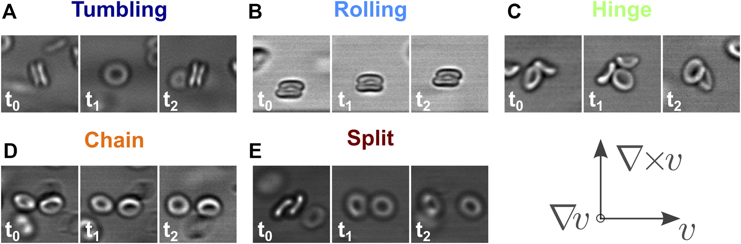 FIGURE 5. The four identified dynamics states of red blood cell doublets during shear flow (A–D), and the final split event (E). For two dynamics states, the cells are attached face-to-face: rolling, where the normal corresponds to the axis of rotation and it points in the vorticity direction (A); tumbling, where the normal undergoes full rations in the velocity-gradient plane (B). There are two intermediate states: (C) hinge, where the side of one cell is attached to the face of the other cell; (D) chain, where cells are flowing side-to-side. See Supplementary Movie S2. Finally split, the cells separate (E). The time values in the picture insets are variable as it depends on the shear rate as shown in Figure 2, here the typical values are in the order of 0.2 s.