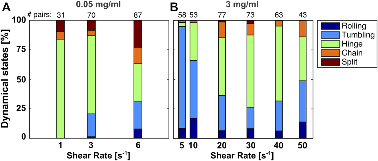 Already in the first frame, we can label the doublets according to these definitions, as each of them has a specific, well-defined morphology. The doublets are then followed in time until they leave the field of view. The projection of the rolling doublets does not change in time and, similarly, the chain state is also stable over time. The projections for the tumbling and hinge states do change, which we used to confirm the initial labeling. We rarely see any changes in the morphologies throughout the movies. However, we occasionally observed the splitting of doublets when it is originally in a tumbling state, especially for the lower shear rates and at the start of the movies.