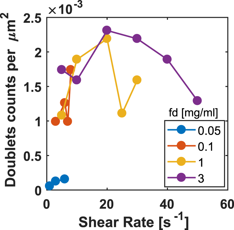 For the higher fd concentrations, see Figure 6B, there is no obvious effect of the shear rate on the number of dynamic states observed. The number of splits is small because we can only define them during the time window of observation. Although, the single cells are not counted here, they are likely a result of the doublets splitting. This can be seen in Figure 7, as we observe less doublets at the higher shear rates.