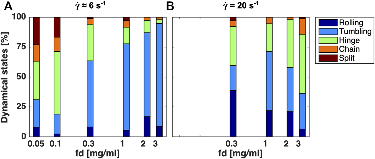 Figure 8A shows the fraction of the dynamic states with increasing fd concentrations at a relatively low shear rate of