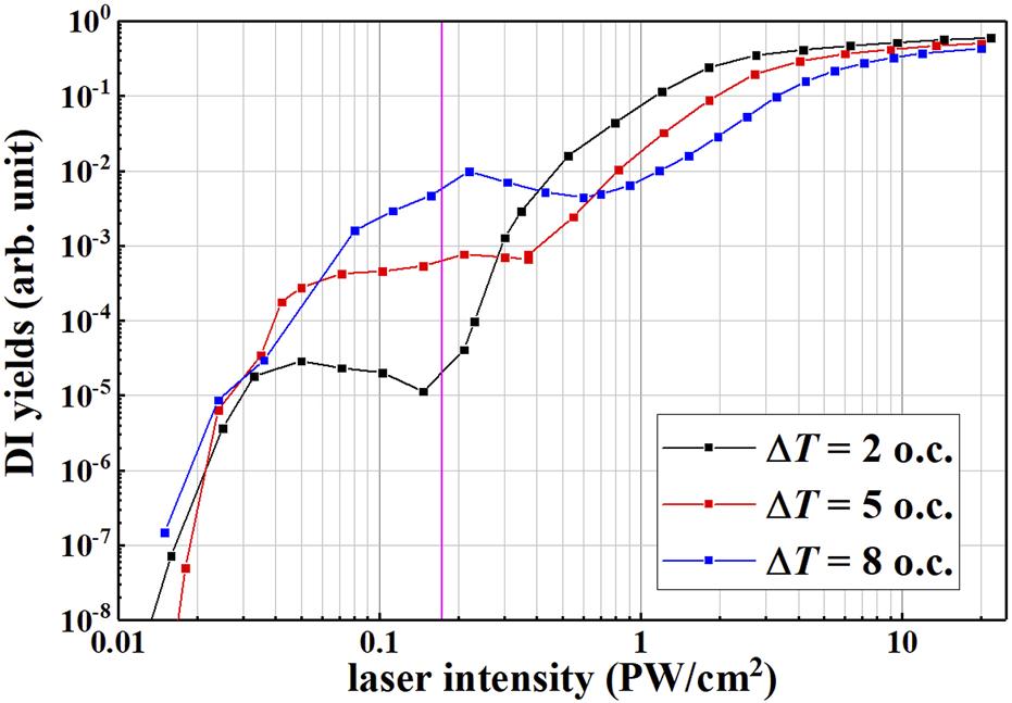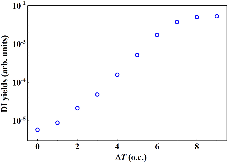 For different delay times ΔT, the curves of double ionization yield with laser intensity all show the feature of “knee” structure. We calculated the effect of time delay on double ionization yield at the electric field strength of 0.16 PW/cm2. As shown by the pink vertical line in Figure 2.