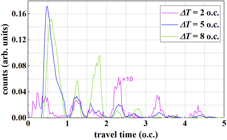 The drift time distribution of ionized electrons with the time delay 2 o.c. (pink line, multiply by 10), 5 o.c. (blue line), and 8 o.c. (green line). The results are calculated with 2 × 108 initial points.