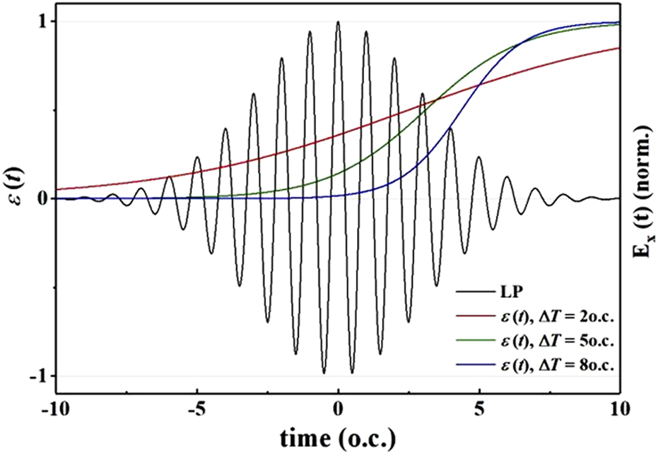 Taking the peak position of the linearly polarized laser as time zero, the variation of ϵ(t) represents the correction of the electric field properties of the linearly polarized laser. Therefore, we compare the time curve of the electric field of the linearly polarized laser along the x-direction with the curve ϵ(t). The lines are drawn in the same figure as the solid black line in Figure 6. The delay time is selected as ΔT = 2 o.c., 5 o.c., and 8 o.c. are shown by the red, green, and blue lines in Figure 6. The three curves reflect the change of the composite laser field from linear polarization to circular polarization with time. The longer the delay time, the faster ϵ(t) increases, and the more lag the area swept over.