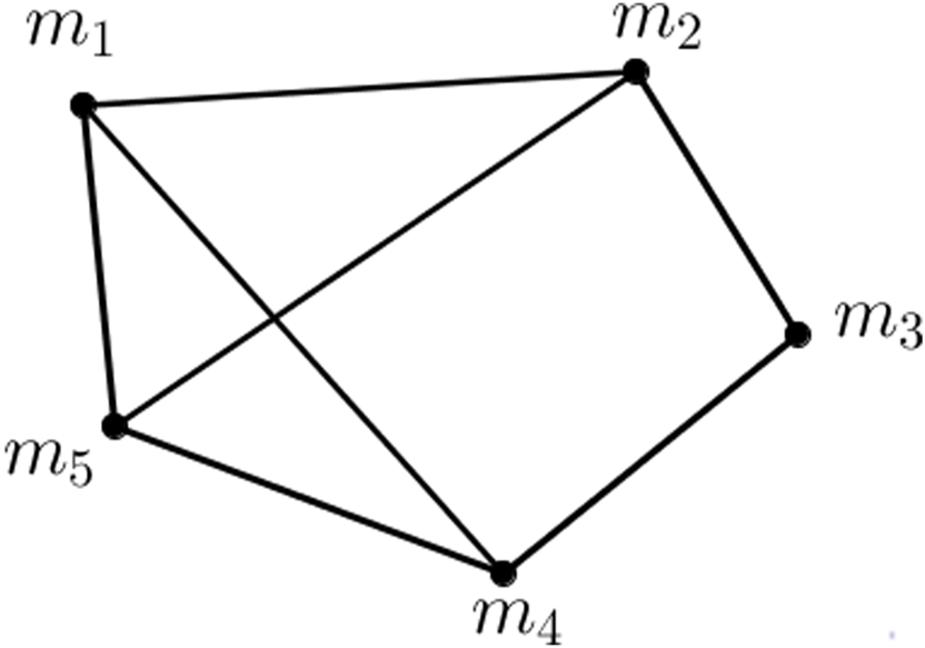 Example 3.2Let there be five companies in the debate competition and Congress members choose one company as the best company according to three important properties, that is, profit-making, revenue, and influence power. Congress members evaluate the communication of three properties between five companies. Suppose X is a set of five companies {m1, m2, m3, m4, m5} and E = {m1m2, m2m3, m3m4, m4m5, m5m1, m2m5, m1m4} is the communication of three properties among companies, we show the scores of vertices and edges in Table 2 and Table 3, respectively. A VVHFG is given in Figure 2.