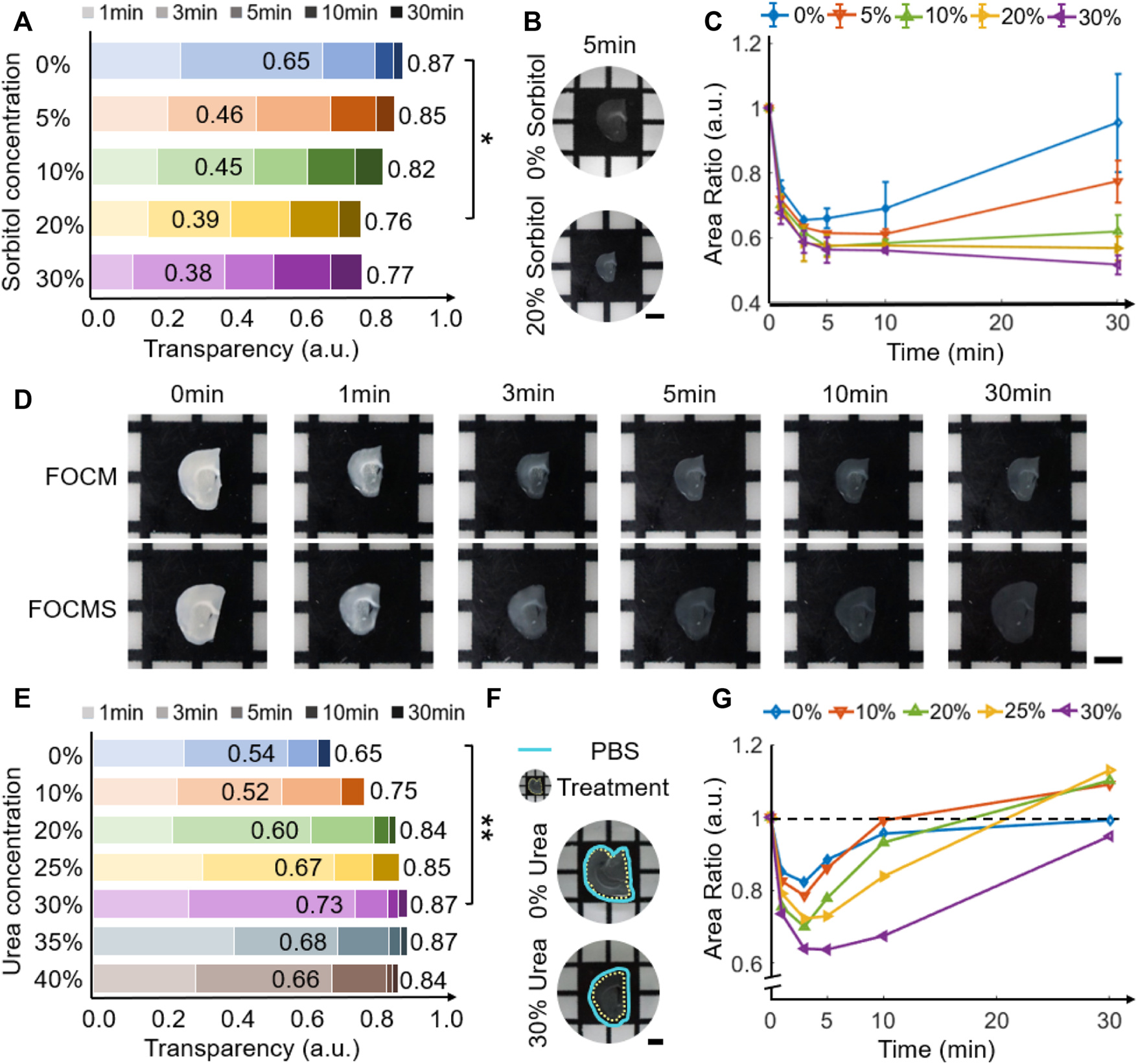 FOCM and FOCMS concentration gradient screening. (A) Variation of transparency with different sorbitol concentrations in FOCM reagent. (B) Comparison of transparency of brain slices using FOCM reagent with sorbitol concentration of 0% and 20% wt/vol for 5 min. (C) Changes of brain tissue area with sorbitol concentration in FOCM reagent. (D) Comparison of optical clearing effects between FOCM and FOCMS at 0 min, 1 min, 3 min, 5 min, 10 min and 30 min (E) Variation of transparency with different urea concentrations in FOCMS reagent. (F) Morphology caused by FOCMS reagents. The cyan solid line is the slice boundary before optical clearing, and the yellow dotted line is after optical clearing. (G) Changes of brain tissue area with urea concentration in FOCMS reagent. Scaler bar: 2 mm, statistical significance (**p < 0.01, *p < 0.05).