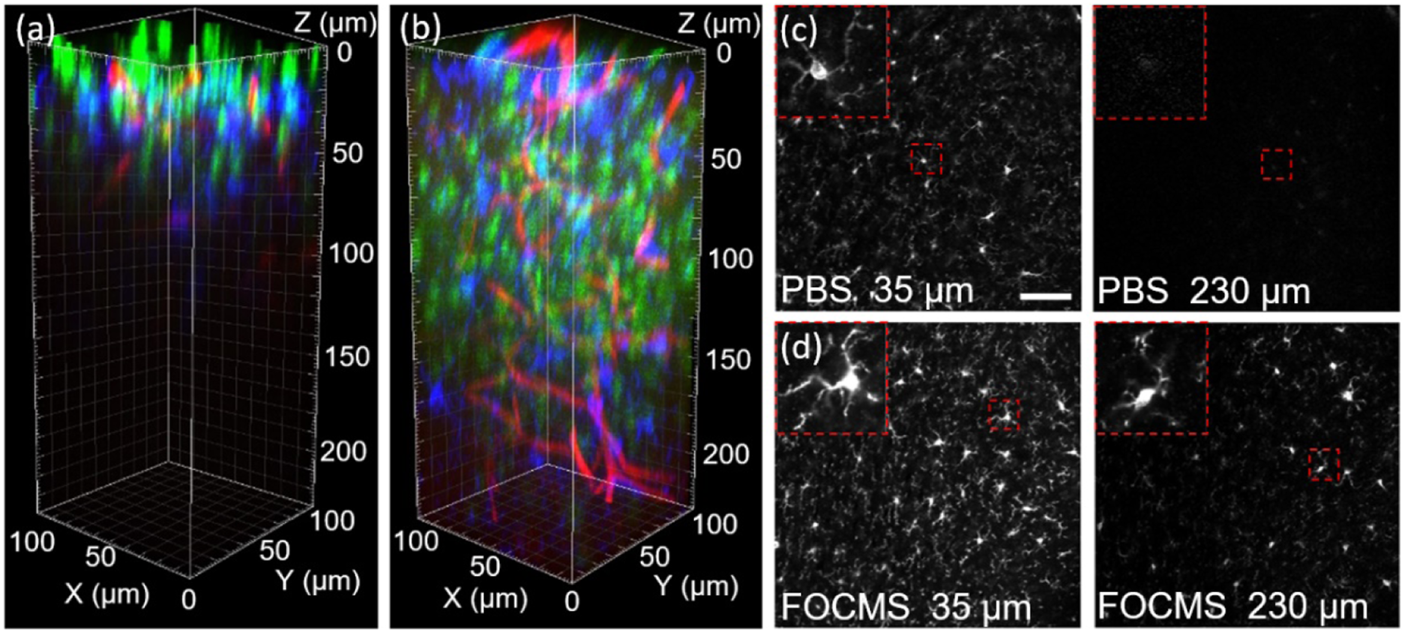 FOCMS significantly improves the depth and quality of imaging with minimal time and effort which shows great potential in the applications of clinical diagnosis and treatment, pathological analysis, etc. Here, we demonstrated an application using FOCMS in human brain tissue imaging. As shown in Figures 5A,B describe the three-dimensional LSCM imaging of normal human cerebral blood vessels and brain glioma (GBM) without optical clearing, respectively. The top left image is the original imaging result, the top right image is the detailed structure of blood vessel morphology, and the bottom two images are the selected single imaging at the depth of 50 μm (left) and 200 μm (right) in (a) (b), respectively. Unfortunately, using these imaging results without optical clearing, the morphological differences are not sufficient to distinguish between normal human brain tissue and glioma, and pathological analysis cannot be performed.