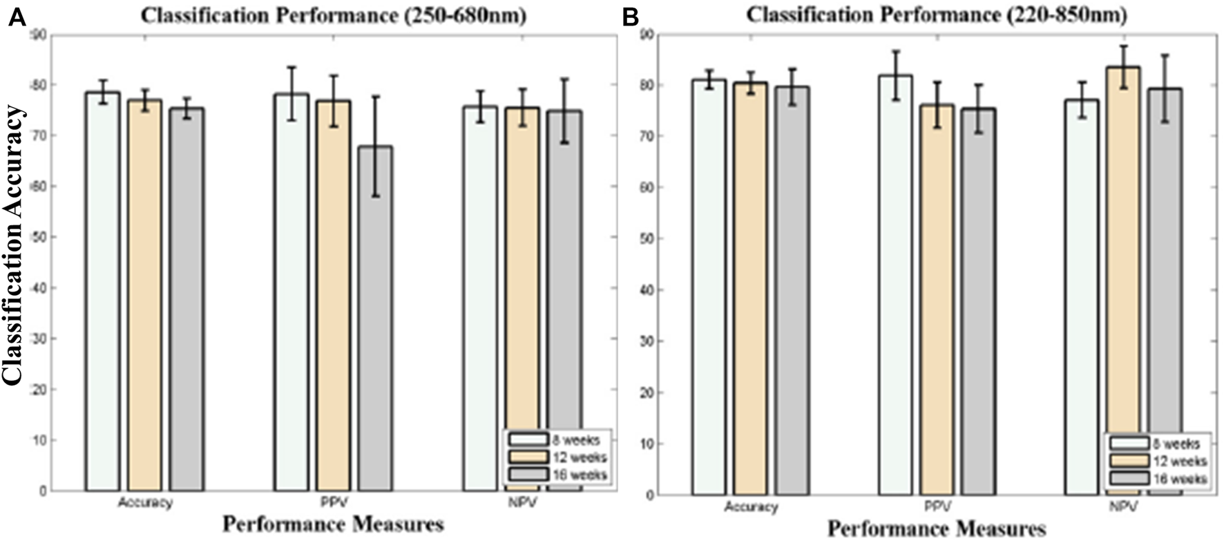 The achieved classification accuracy result of RF technique (A) in the wavelength range of 250–680 nm (B) and 220–850 nm [18].
