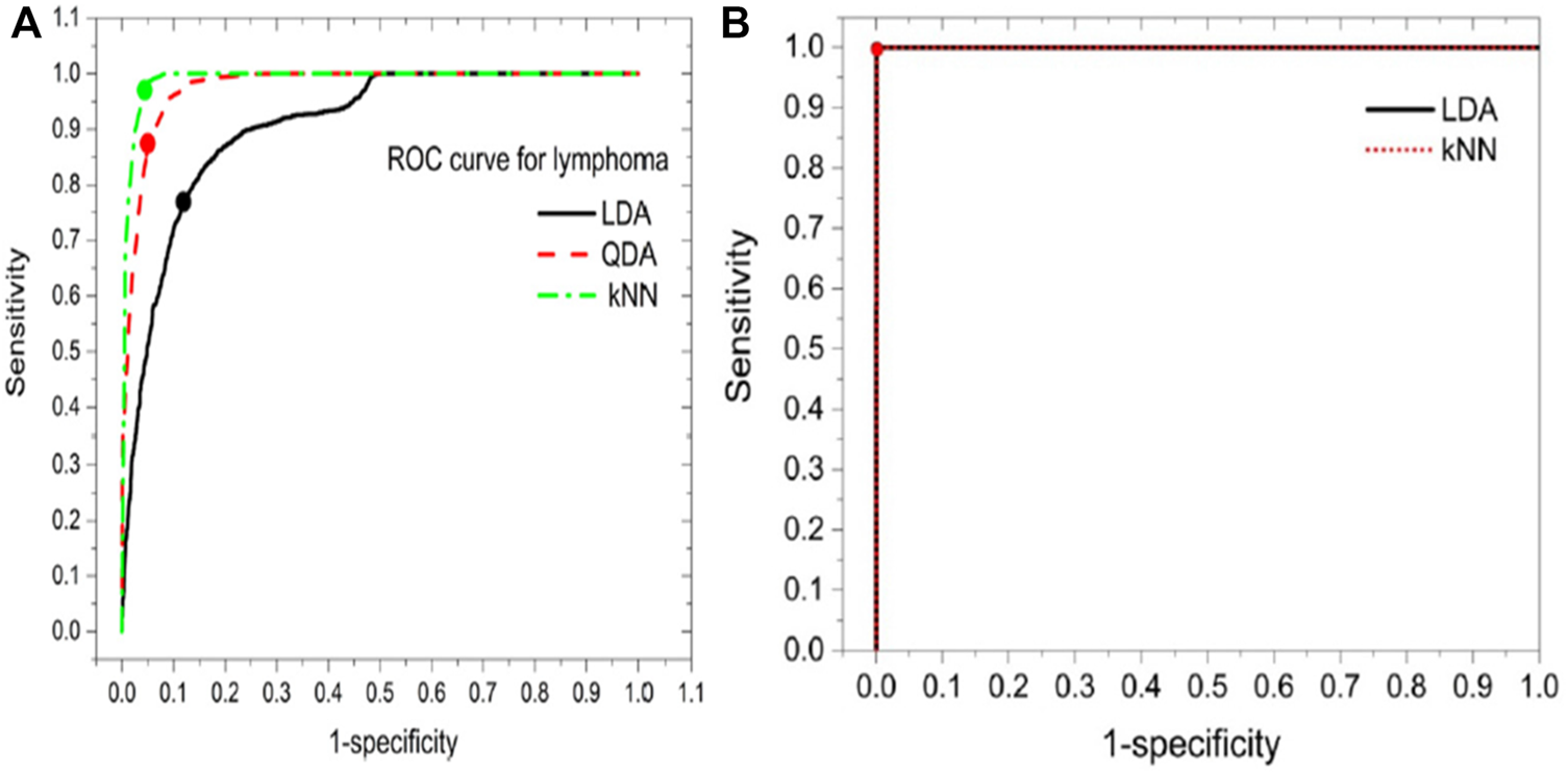 (A)The ROC curve for the lymphoma class of different classification models [23]. (B) Receiver operating curve (ROC) for the lymphoma class of LDA and kNN models [22].