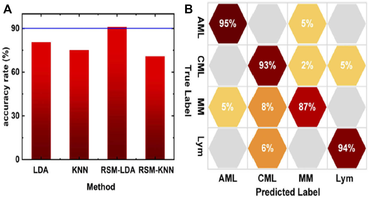 (A) The accuracy rate of different models (B) confusion matrix of RSM-LDA [48].