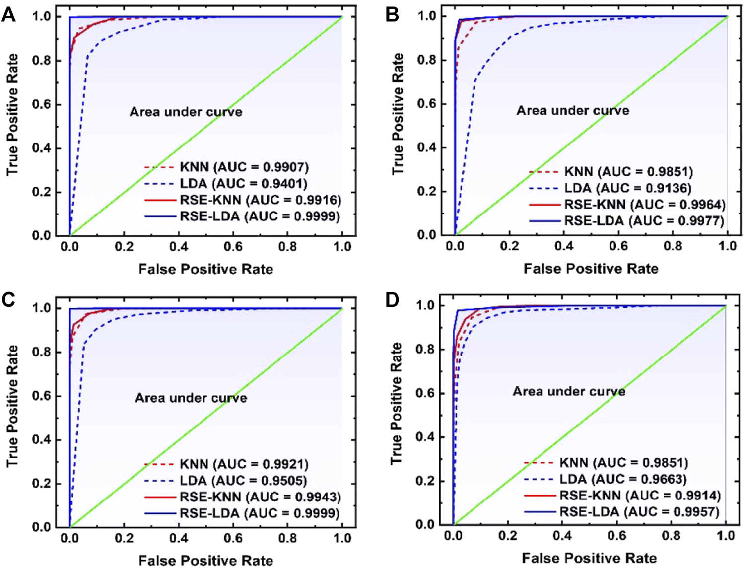 Similarly, in the third paper, a technique uses random subspace method (RSM) based ensemble learning such as RSM-LDA in conjunction with LIBS [48]. They studied the Leukemia subtypes of blood cancer like acute myeloid leukemia (AML), chronic myelogenous leukemia (CML), and MM and lymphoma. The variable importance (VI) of the selected lines was determined to evaluate the significance of the function. The RSM-LDA model has the highest overall precision rate and AUC, compared to LDA and kNN, which means that the RSM-LDA model has the highest accuracy, as shown in Figure 3. Furthermore, Figure 4 manifests the best performing classification ROC curve for four different blood cancers. With the RSM-LDA model, the overall accuracy ratings for AML vs healthy control (HC), CML vs HC, MM vs HC, and lymphoma vs HC ranged from 94.33, 94.49, 94.61, and 94.38%–98.77, 96.54, 98.78, and 96.62%, respectively. In the above two papers of blood cancer, the serum sample and whole blood sample are used on filter paper, while in the third paper about blood cancer the whole blood sample used in the form of pellets.