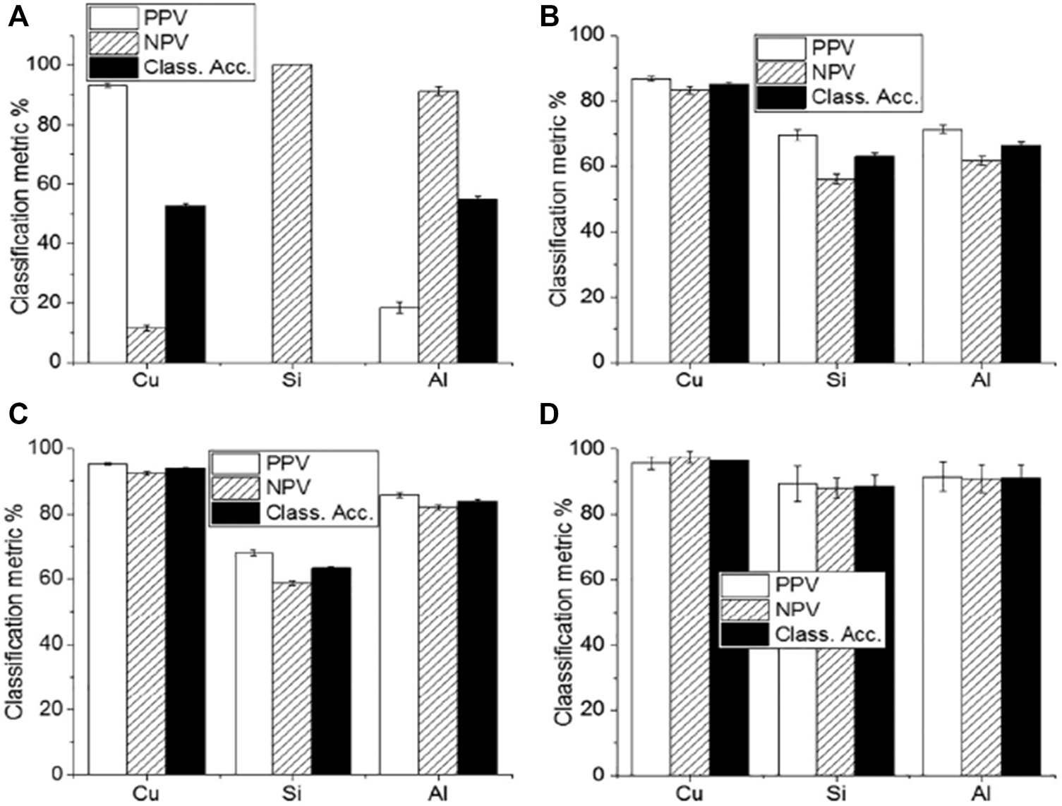 The classification accuracy result of (A) LDA (B) FDA (C) SVM and (D) Gradient boosting with different substrates of Cu, Si and Aluminum [54].