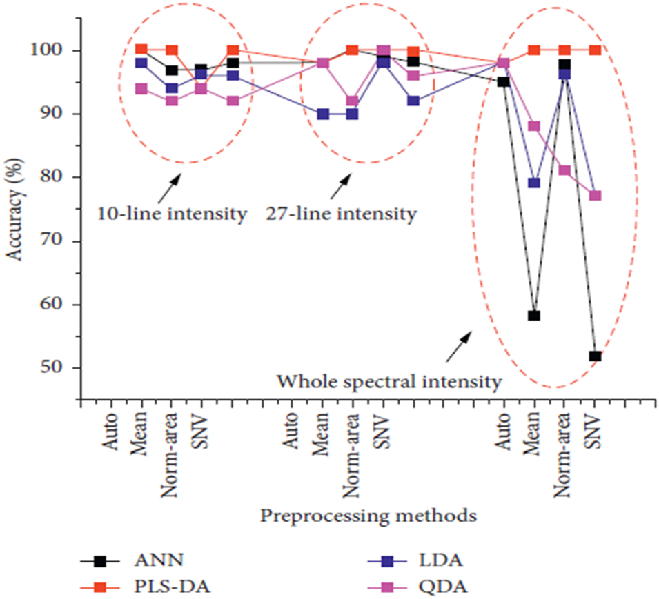 The classification accuracy of ANN, PLS-DA, LDA, and QDA models by using multiple preprocessing methods with different input data types [53].