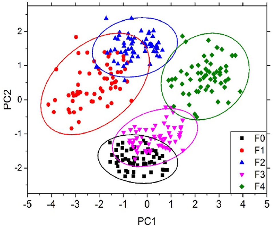 PCA score of different MTAVIR scores from F0 to F4 [57].