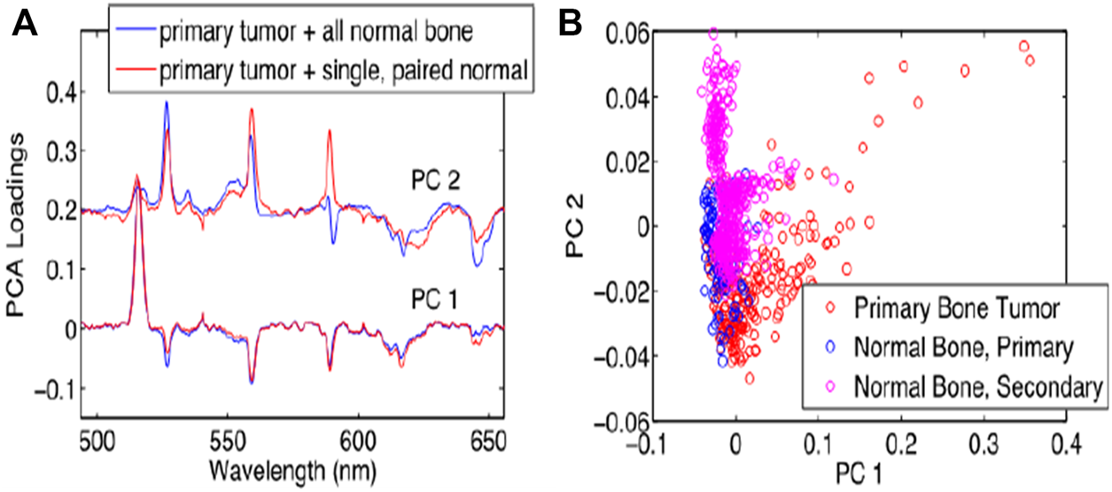 Bone cancer occurs when abnormal cells in bone grow out of control [71]. It damaged normal bone tissue. The most prevalent bone cancer is osteosarcoma. This is responsible for almost two-thirds of all bone cancers cases. About 1,200 patients are diagnosed annually in the United States with osteosarcoma [72–75]. For the classification of bone tumors, Gill et al. [74] proposed research to understand the variations in femtosecond LIBS (fsLIBS) spectra. For laser ablation, they used samples of a primary bone tumour, a secondary bone tumour, and normal bone in this study. Essential differences in the fsLIBS signal between the primary tumor of the bone and normal bone samples were observed. They compared the separation of tumour and normal tissue with many other “normal” bone samples using a PCA decomposition of this combined data set. The PCA results revealed that the PCs of the two data sets substantially overlap, which shows that even when fresh new normal bone tissue is added to the data, the chemical distinctions between normal and cancerous tissue remain consistent. In tumor tissue, the magnesium (Mg) peak level (516 nm) increases compared to the calcium (Ca) peak intensity (526 nm) as well as PCA results are shown in Figure 9. The explanation why they did not notice a difference in the spectrum between metastatic bone tumor and normal bone may be because primary cancer cells migrate across the body, and other forms of cells may not cause a metabolic change (such as bone).
