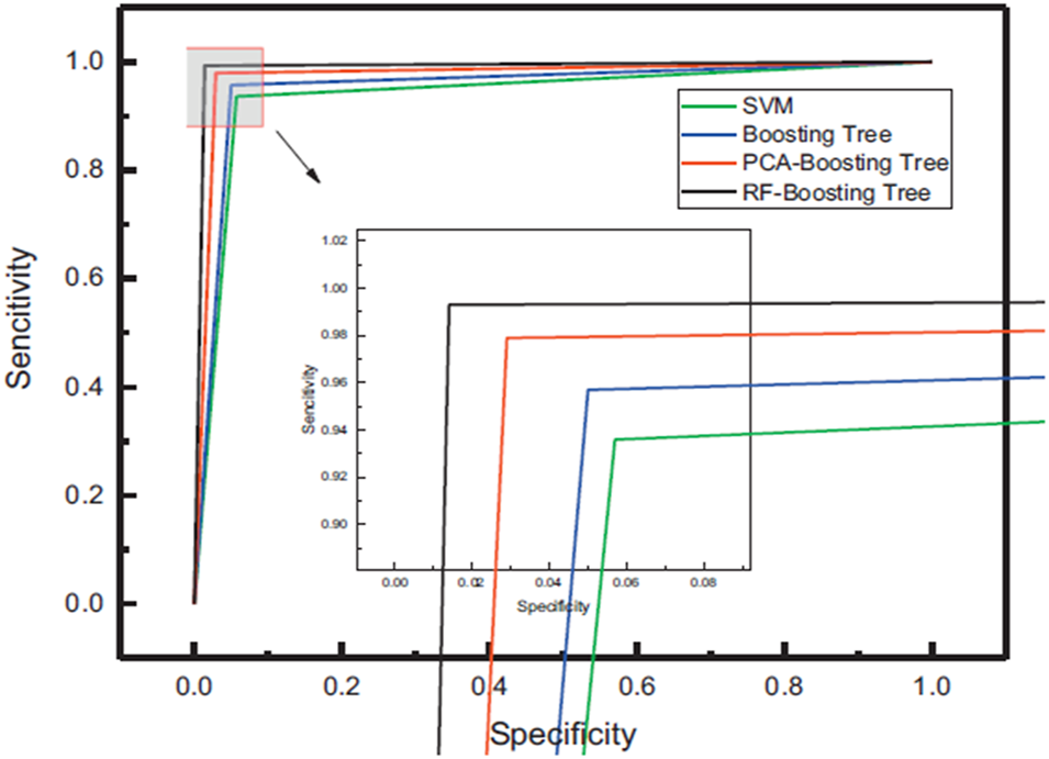 Lung cancer has long been seen as a significant public health issue. Every year, around 1.35 million people are diagnosed with the disease, with 1.18 million dying. This statistic is considerably higher than other cancers like breast and colon cancer, and the death rate in China and other countries is still rising [76]. The line between the lung tumour and the border tissue is blurry, during surgery. Recurrence can shorten a patient’s life if tumour excision is incomplete [77]. Lin et al. [36] used LIBS combined with machine learning techniques to differentiate lung boundaries from lung tissues. For this purpose, they used 90 tissue samples of lung tumor and lung boundary from 45 patients, of which 20 men and 25 were female, respectively. They used SVM and Boosting Tree classification models that employ PCA and RF to enhance accuracy, sensitivity, specificity, ROC curves, and AUC through 10-fold cross-validation. The RF-Boosting tree outperformed the competition in classification and recognition, with an accuracy of 98.9%, sensitivity and specificity of 99.3 and 98.6%, respectively, and an AUC of 0.988., as shown in Figure 10. The use of RF features increases data retention, reduces training time, and avoids duplicate data and interference. The combination of LIBS with an RF-Boosting Tree model to detect lung tumour boundaries is a rapid and accurate method.