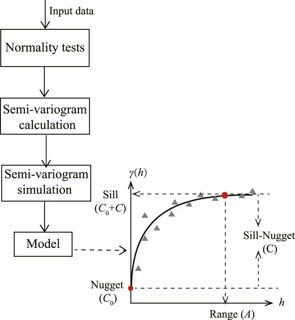 The semivariogram is a mathematical statistical method that can reflect the randomness and structural characteristics of the variable in the spatial distribution and also is the theoretical basis of geostatistics. First, in order to avoid the proportional effect in the study, it is necessary to test the data of the studied variable (Z) and judge whether it is normal distribution or approximate normal distribution; if not, data conversion shall be carried out to make it conform to normal distribution. Afterward, the calculation of the semi-variance function value is carried out. Finally, through simulation, we obtain the best fitted semivariogram model and some important indicators, such as nugget C0, sill C0 + C, range A, and the structural ratio C/(C0 + C). Figure 1 shows the basic process of this method and the calculation formula of the semivariogram as follows [29]: