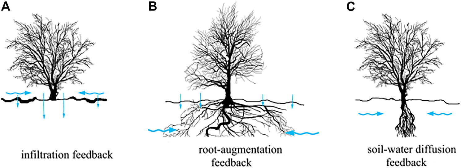 FIGURE 2. Schematic diagram of three feedback mechanisms between vegetation and water. (A) Difference of infiltration rate between bare soil and vegetation covered area causes surface water flow, (B) vegetation roots extend laterally to absorb water, and (C) soil water diffusivity exceed the spread of vegetation biomass. The blue arrow indicates the direction of water flow, and the length of the straight arrow represents the size of infiltration rate.