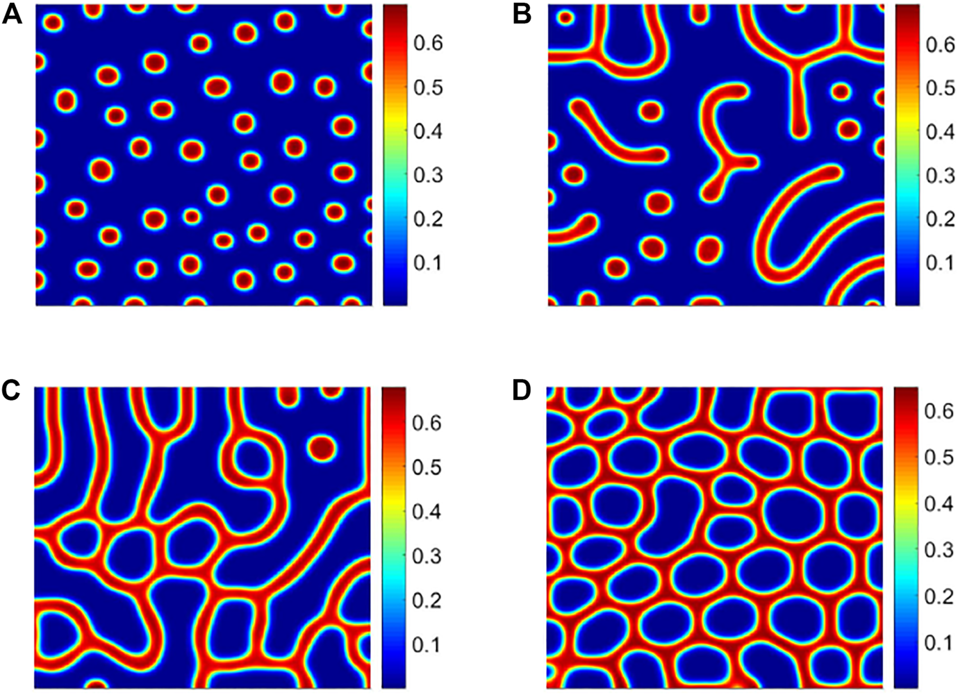 FIGURE 3. Vegetation pattern structure under different shading rates ρ. (A) Hot spot pattern with ρ = 0.6; (B) spots–stripes mixed pattern with ρ = 0.75; (C) stripe pattern with ρ = 0.9; (D) cold spot pattern with ρ = 0.94. See Table 1 for the other parameter values.