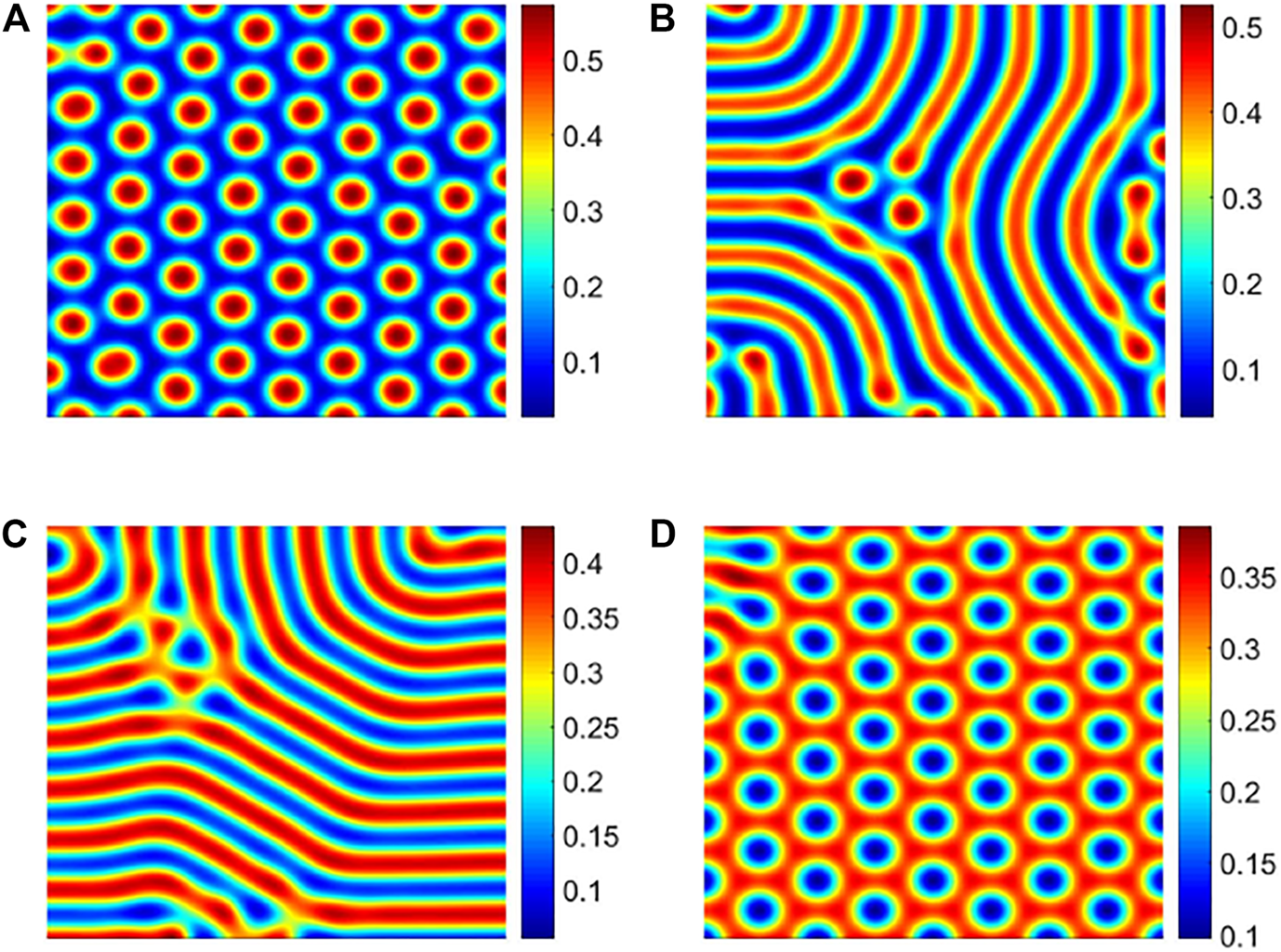 FIGURE 5. Different patterns of infected individuals. (A) Hot spot pattern with β = 32; (B) spots and stripes mixed pattern with β = 35; (C) stripe pattern with β = 40; and (D) cold spot pattern with β = 42.