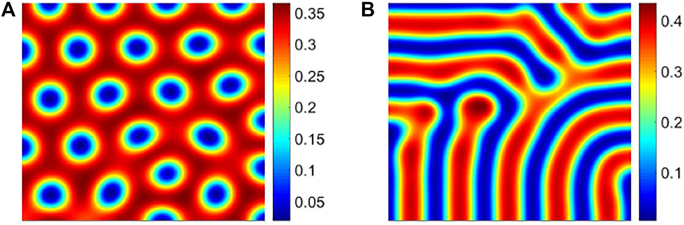 FIGURE 6. Different pattern structures of prey population. (A) Cold spot pattern with γ = 1.95; (B) stripe pattern with γ = 2.05.