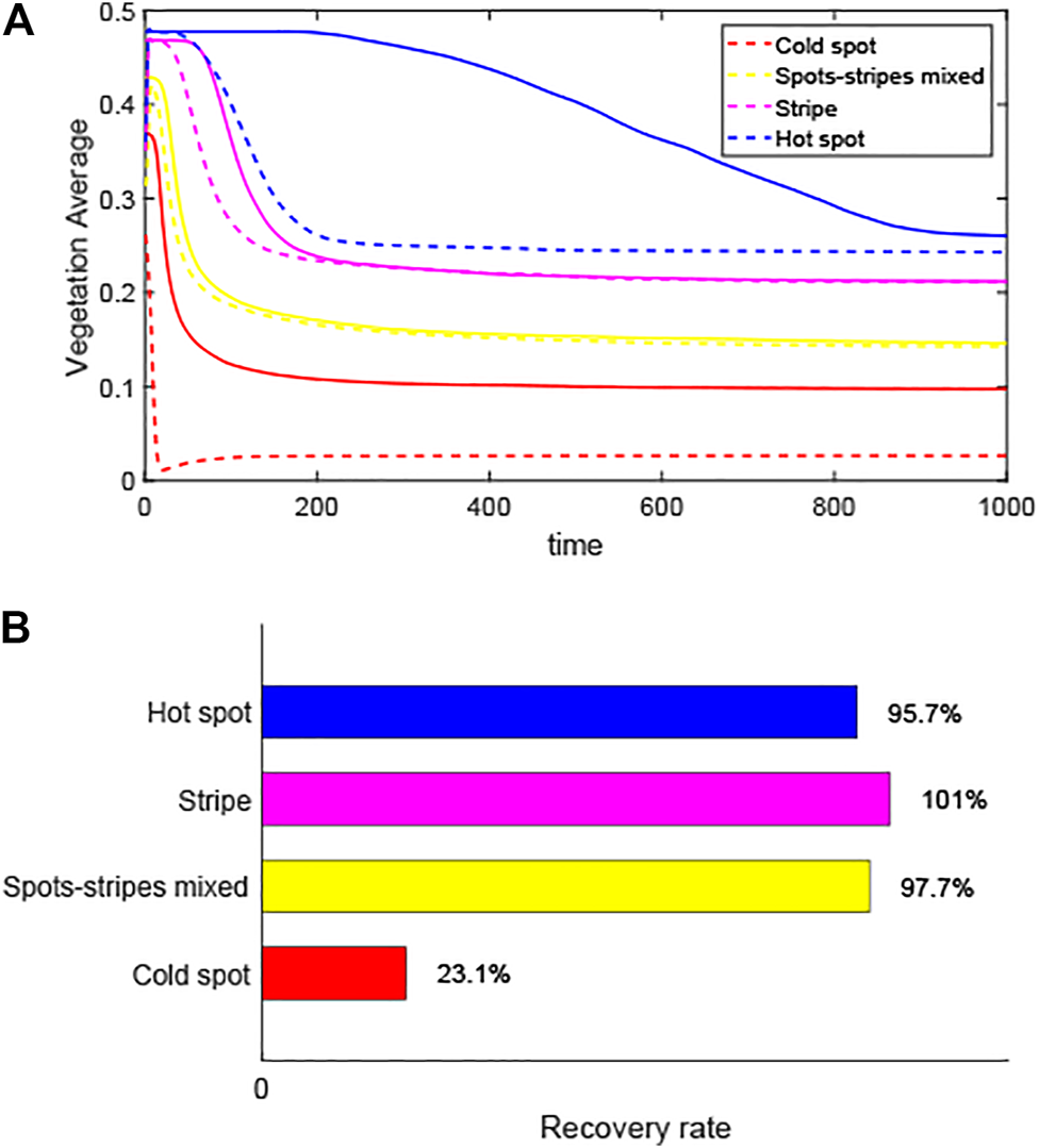 FIGURE 7. Recovery of different pattern structures for same disturbance. (A) Trajectories of different patterns when they return to steady state after the 20% disturbance occurs. Solid lines: trajectories of patterns formation; dashed lines: recovery track after the equilibrium point is reduced by 20%. (B) Recovery rates after a disturbance.