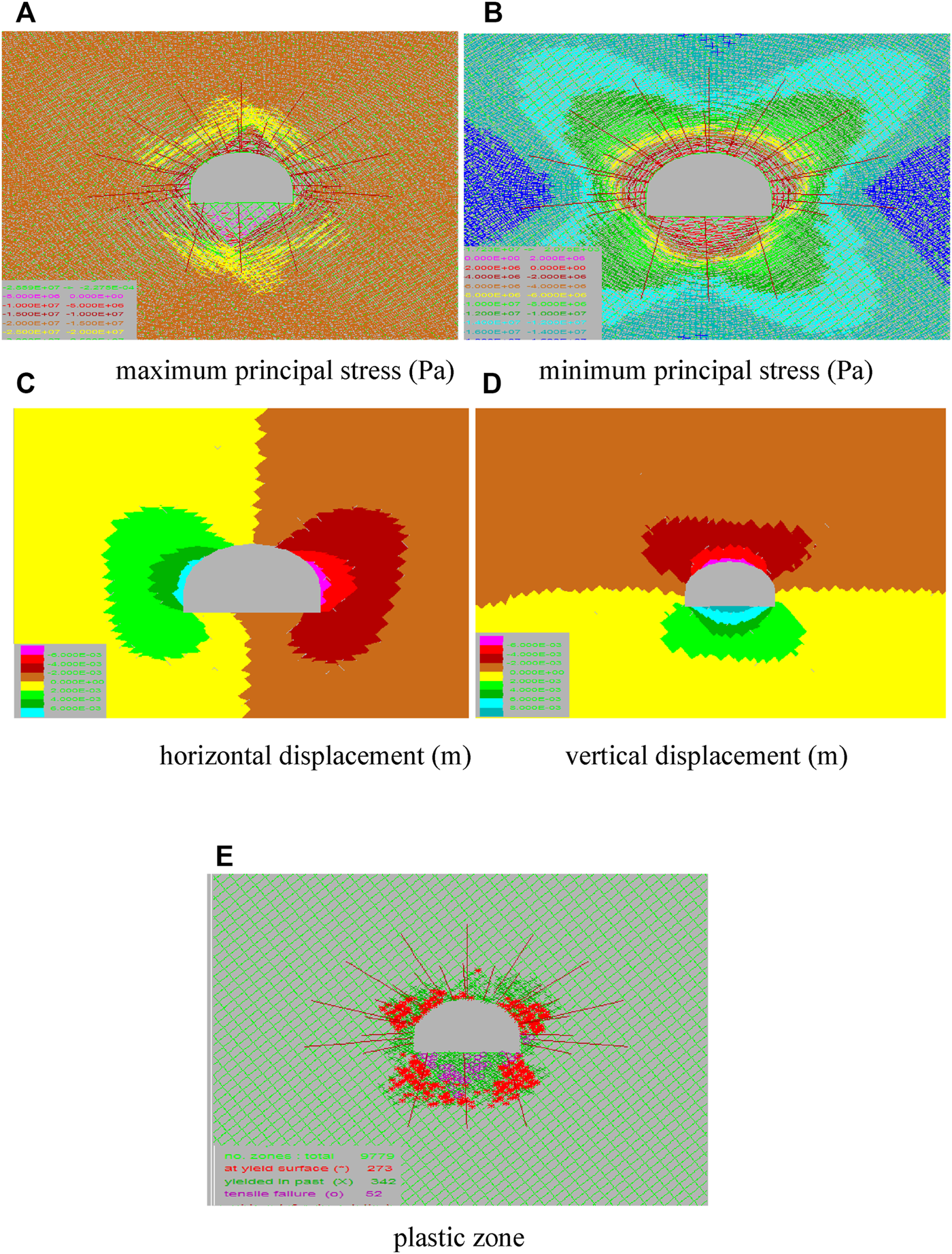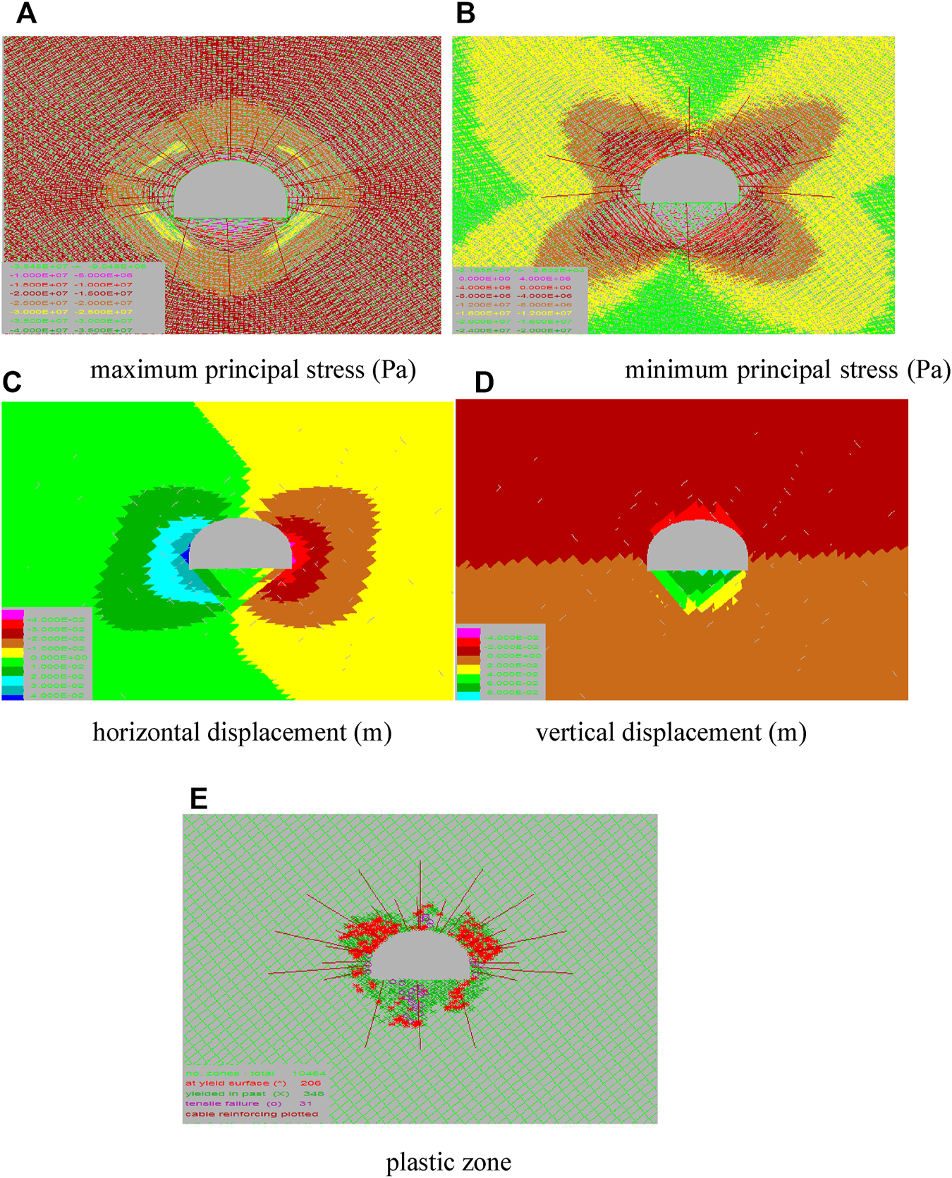 The engineering geological model of the tape machine roadway is built by UDEC based on appropriate simplification. The geometry of the model is 70 m 45 m. There are 7,544 blocks, 51,268 units, and 48,700 joints. First, the model reaches the equilibrium state in in situ stress, and then the roadway is excavated. The combined supporting technique is applied to the shear stress concentration zone in the spandrel, the tensile stress concentration zone in the sides, and the floor: the prestressed high strength shear bolt, the prestressed anchor cable, and grouting. The grouting material is divided into common concrete grouting material (Scheme I) and high-performance grouting material (Scheme II). The space between two bolts is 700 × 700 mm, and the length of a bolt is 2,800 mm. The space between two anchor cables is 1,400 × 1,400 mm, and the length of an anchor cable is 6,000 mm. The thickness of the grouting layer is 150 mm.