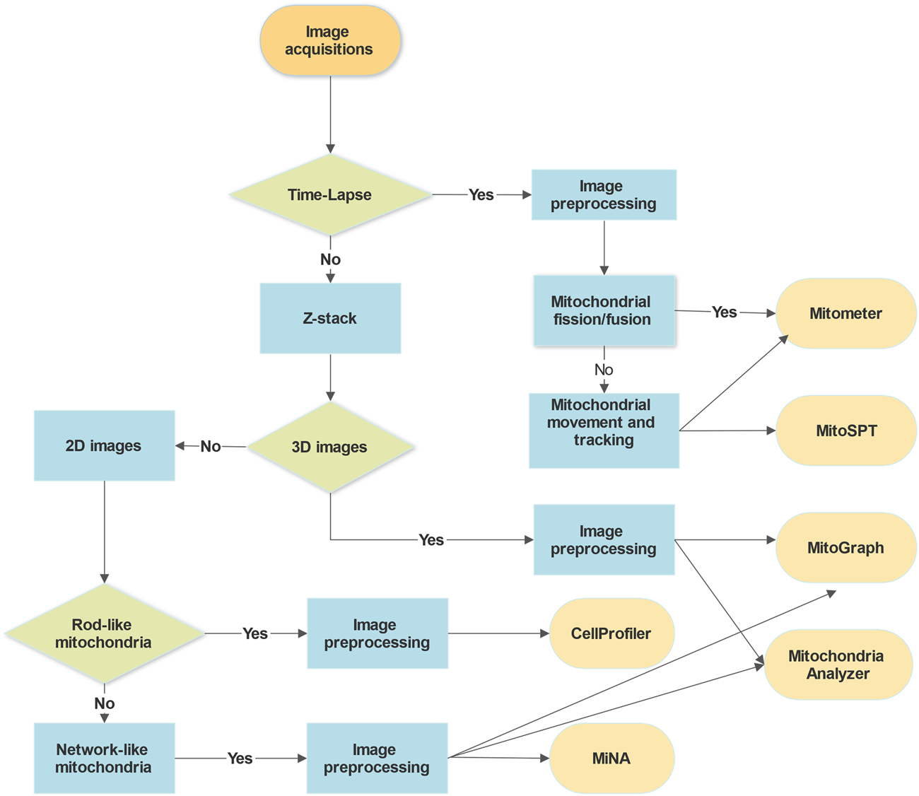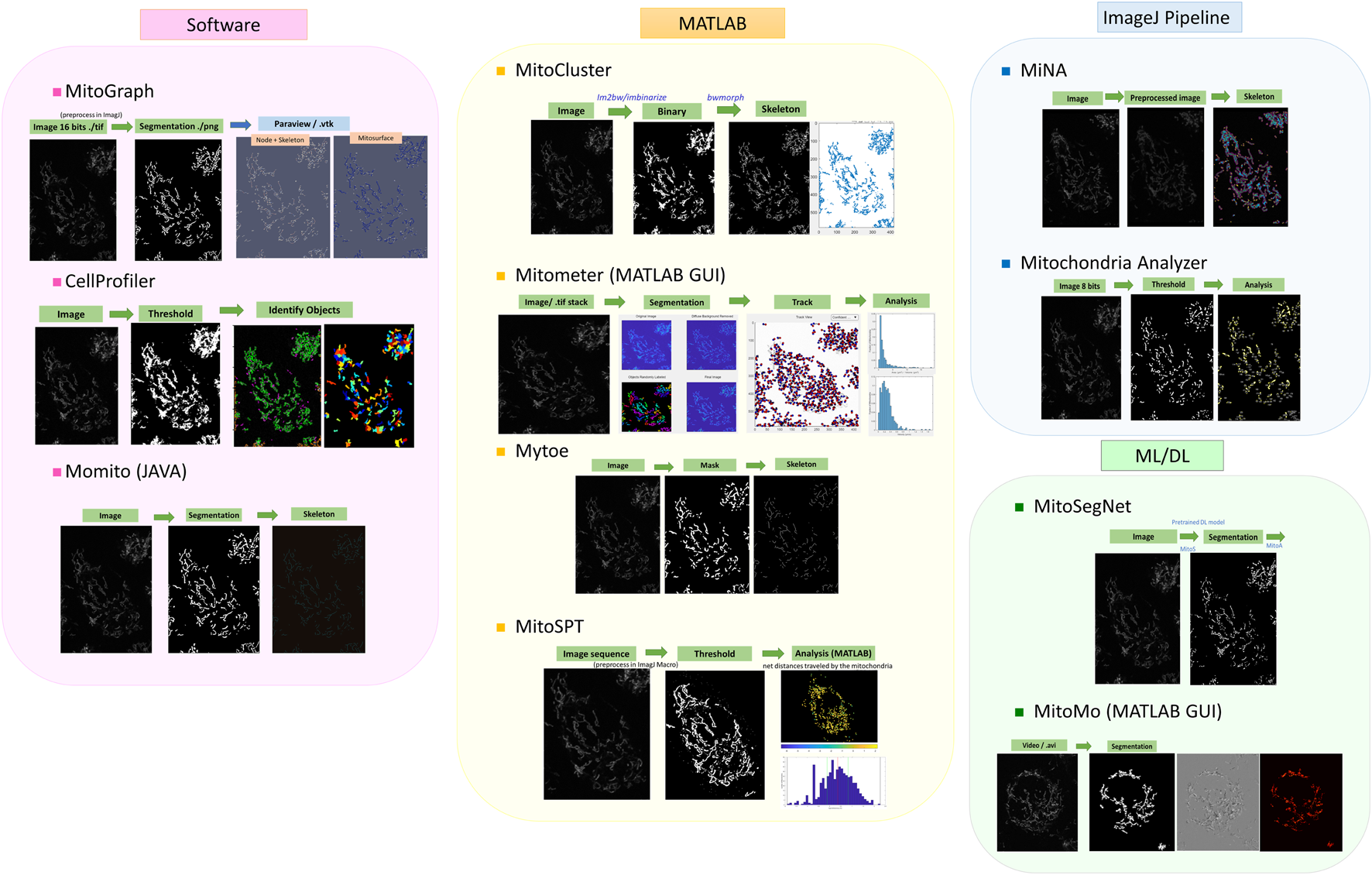 After obtaining fluorescent images, the next step is to determine a proper method for analyzing the images and revealing the morphological information. Although manual classification is straightforward and intuitive, it is laborious and lacks precise and quantitative criteria. Therefore, researchers have developed software and pipelines to automatically process and analyze images in a high-throughput manner. Several image analysis tools or software packages are currently available with detailed pipelines and procedures or are released as open-source software (Table 1). The selection of tools from all of these sources according to the image features and functional needs can make image analysis more efficient and effective. Within this scope, mitochondrial fluorescent image analysis tools in different platforms and applications are reviewed and compared, including traditional image processing pipelines as well as emerging machine learning and deep learning methods.