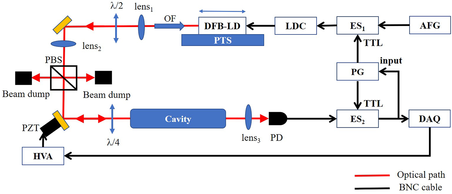 Experimental setup for OF-LCRDS. PG: pulse generator; ES1,2: homemade electronic switch; AFG: arbitrary function generator; LDC: laser diode controller; DFB-LD: distributed feedback diode laser; PTS: precision translation stage; λ⁄2: half-wave plate; PBS: polarization beam splitter; PZT: piezoelectric transducer; HVA: high voltage amplifier; PD: photodetector; and DAQ: data acquisition card.